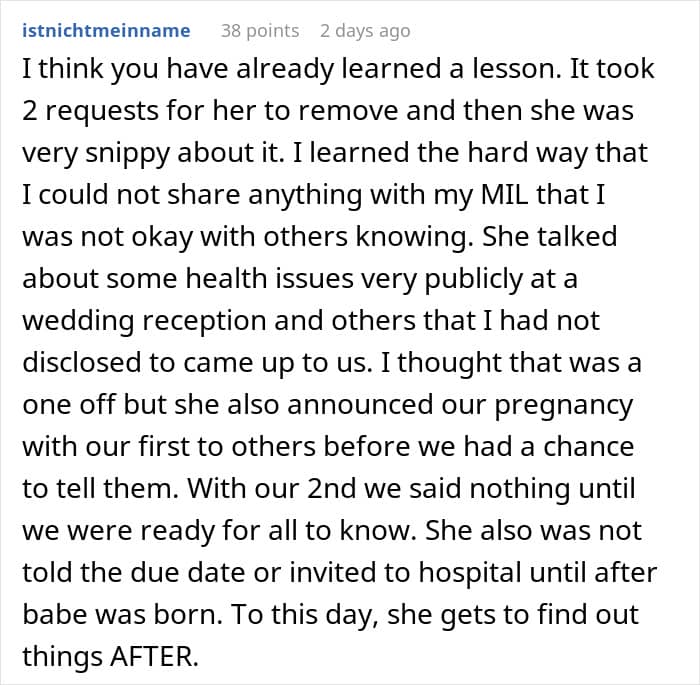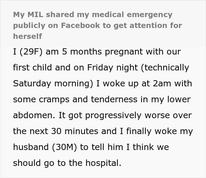 When one woman had a health scare five months into her pregnancy, she was extremely relieved to find out that her baby would be just fine. But the real drama started when she realized that her mother-in-law had been publicly posting about the medical emergency on social media. Below, you’ll find the full story that the mom-to-be shared on Reddit, as well as some of the replies concerned readers left her.