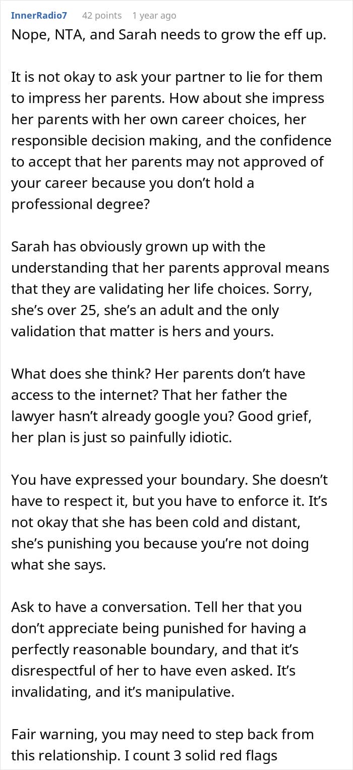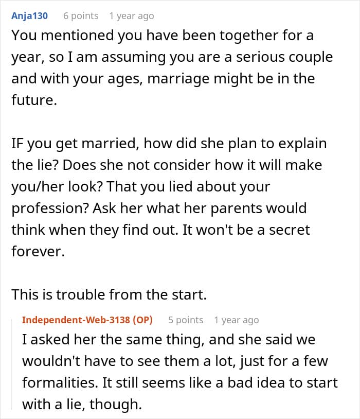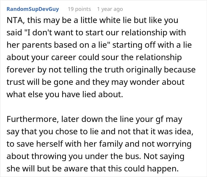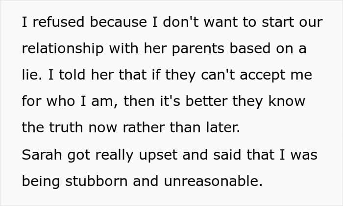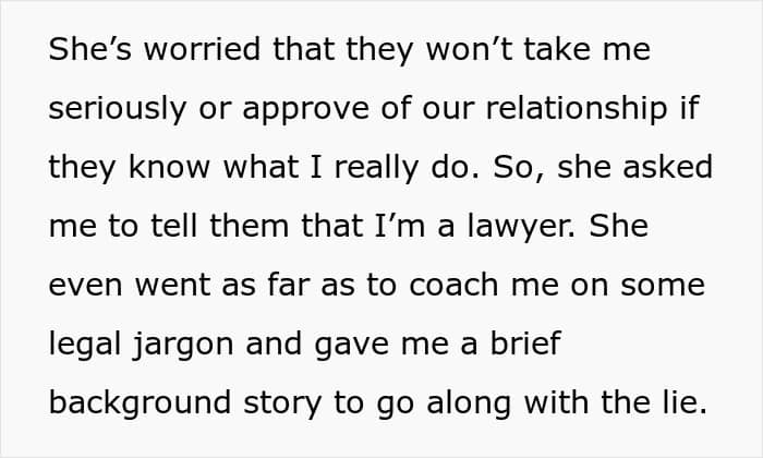 That’s why one man refused to go along with his girlfriend’s plan to lie to her parents about what he does for a living. But now, he’s wondering if her idea to bend the truth is signaling the end of their relationship. Below, you’ll find the full story that the author posted on Reddit, as well as some of the replies that invested readers shared.