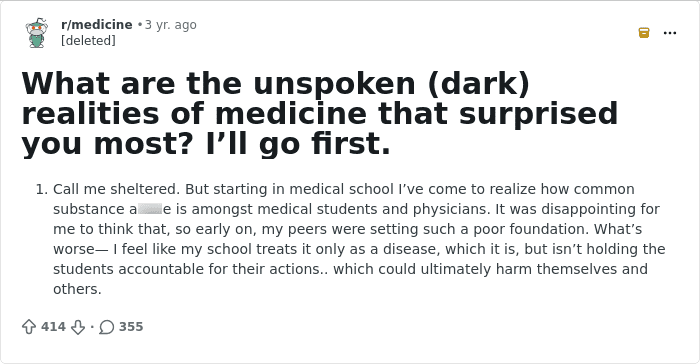 They’ve been spilling some secrets online, in response to someone asking, “What are the unspoken (dark) realities of medicine that surprised you most?” From battles with mental health and substance use to admissions that medical professionals are merely making “educated guesses,” each answer takes us deeper into the minds of those who have chosen to save lives for a living. We has put together a list of the best ones below. Don’t forget to upvote your favorites.