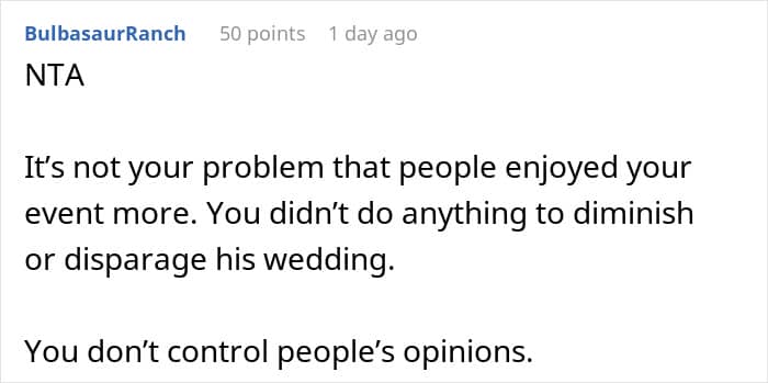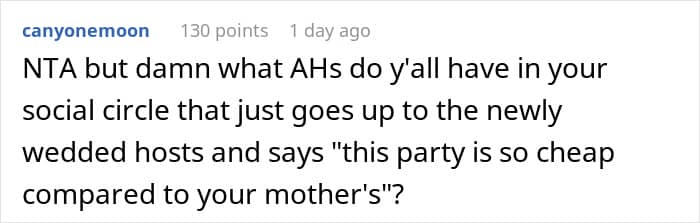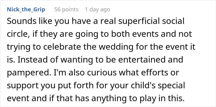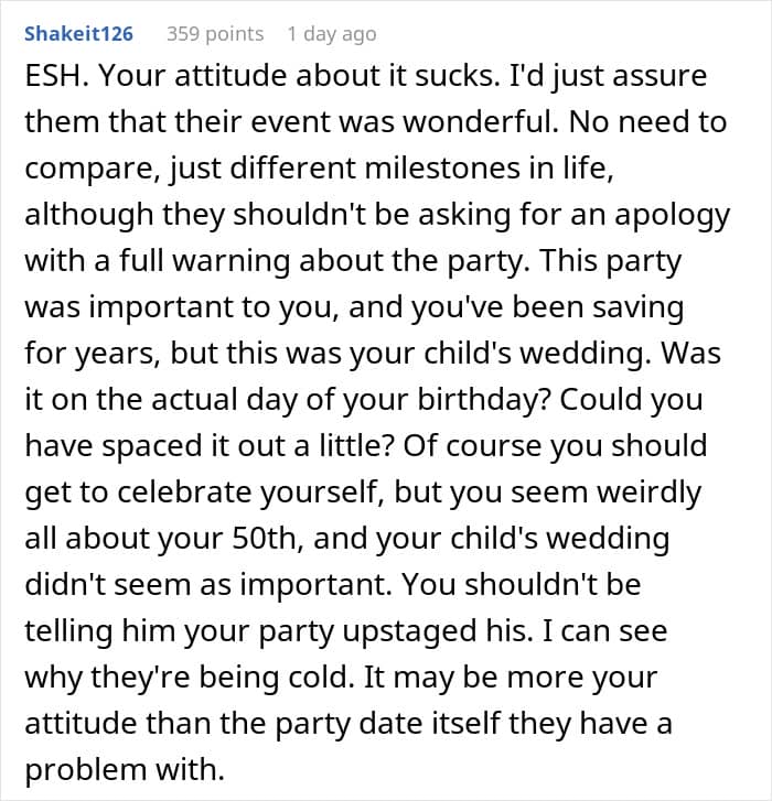 “In this case, the parent’s lavish birthday party inadvertently overshadowed the significance of their child’s wedding, leading to hurt feelings and conflict. It is essential for parents to support their children’s milestones without measuring them against their own experiences, allowing each individual event to be celebrated and cherished in its own right.”