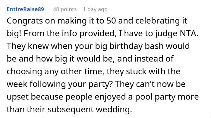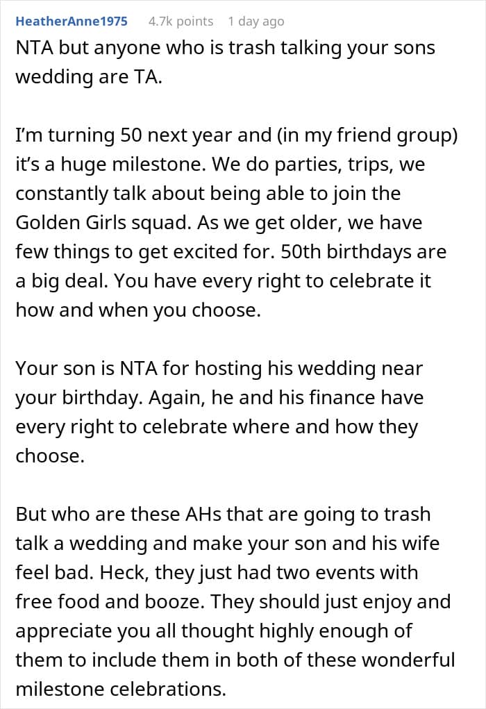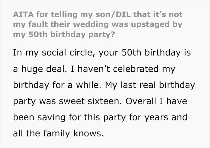 One man, however, decided to hold his wedding just one week after his mother’s 50th birthday. That alone wouldn’t be an issue—except she warned the couple well in advance that she was planning a big celebration. They didn’t think much of it, until the party happened and ended up being the talk of the town, completely overshadowing the wedding that followed.