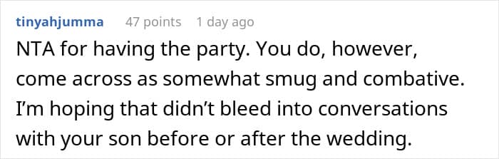 “In this case, the parent’s persistent efforts to upstage their child’s wedding with their own extravagant birthday celebration clearly had a negative impact that have even led others to speak negatively toward their son’s wedding.”