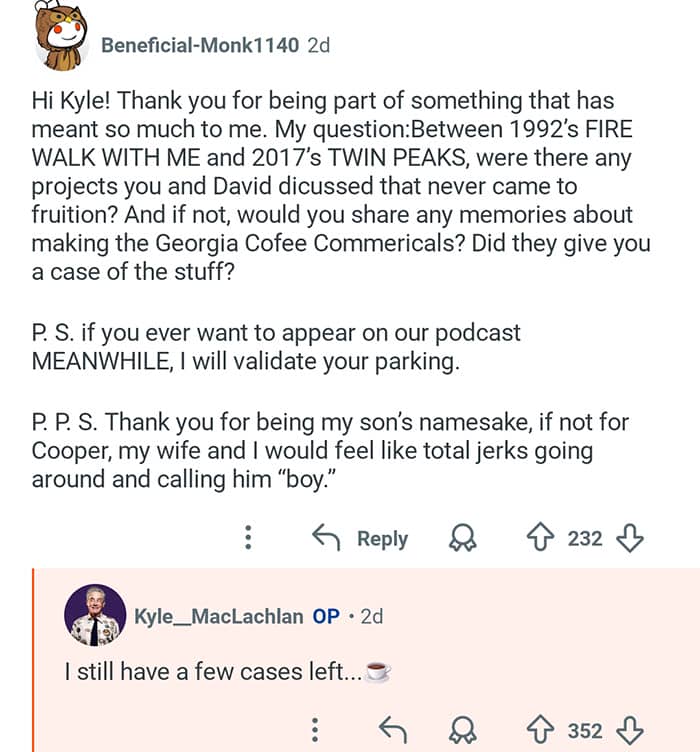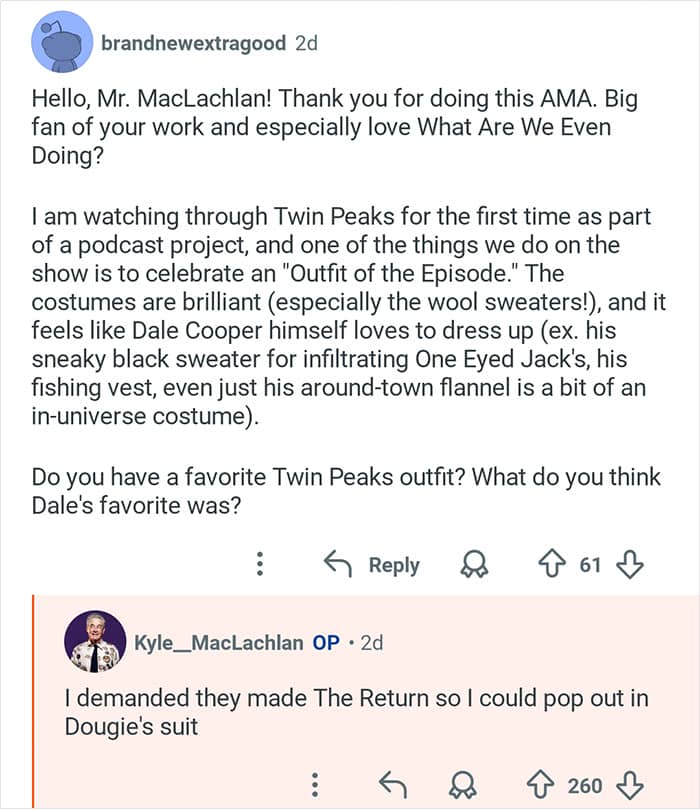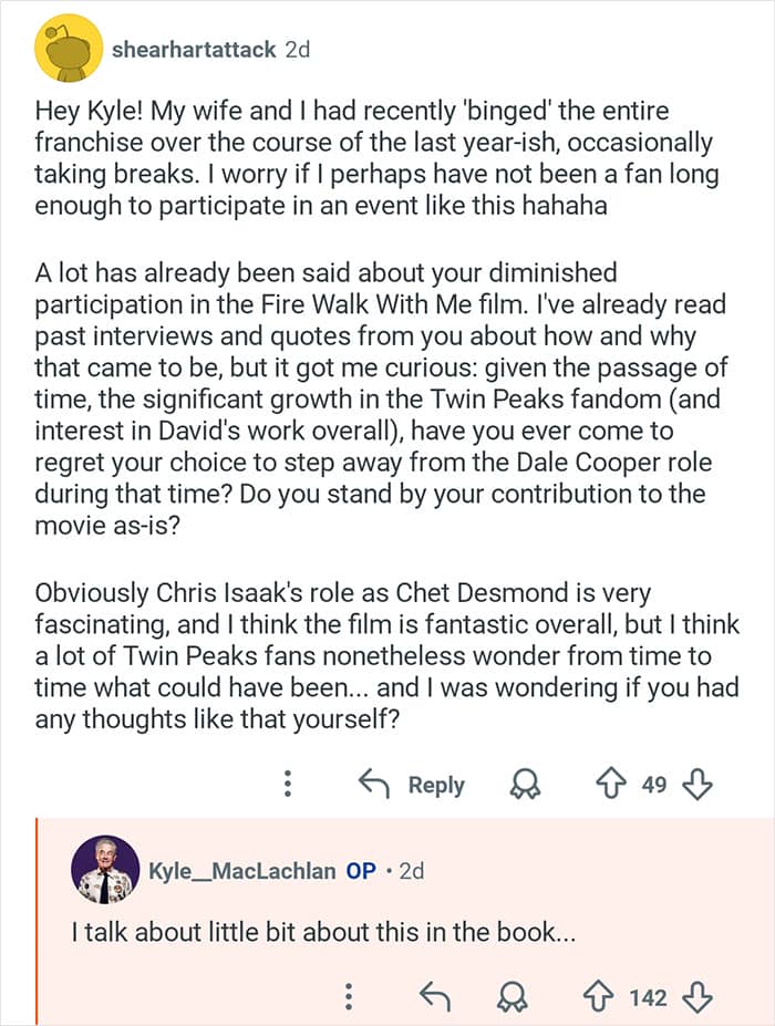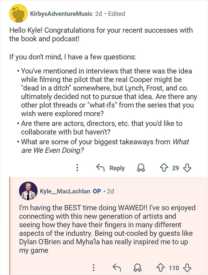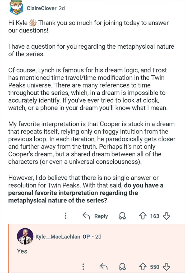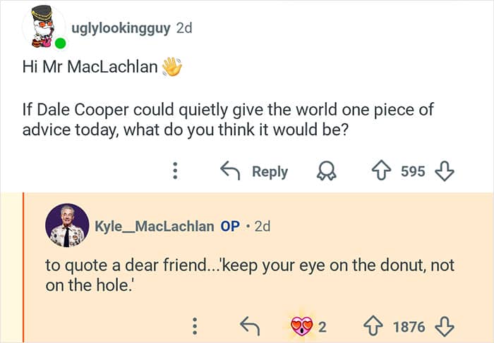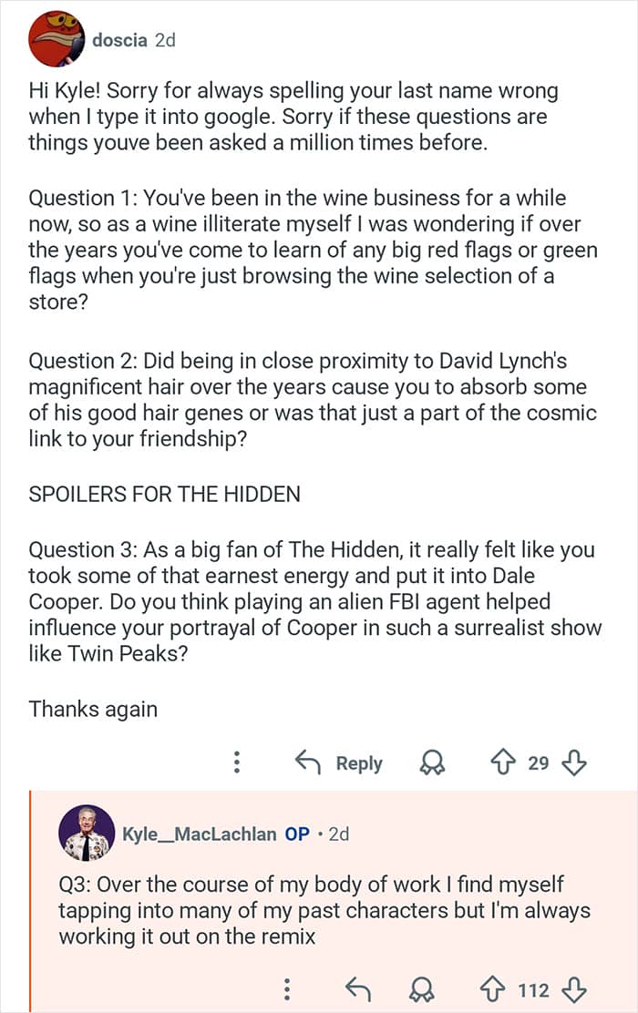 Twin Peaks star Kyle MacLachlan hosted an “Ask Me Anything” where he responded to fans’ burning questions