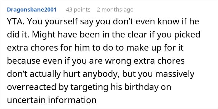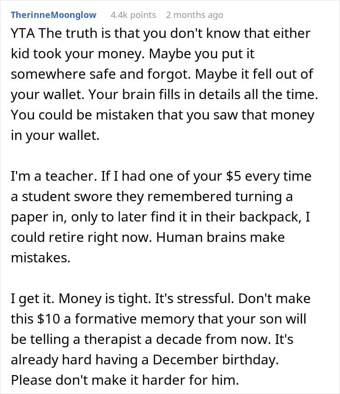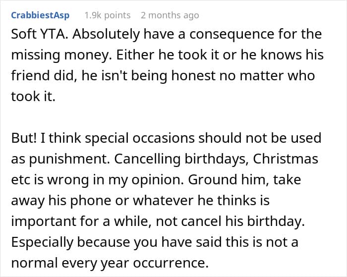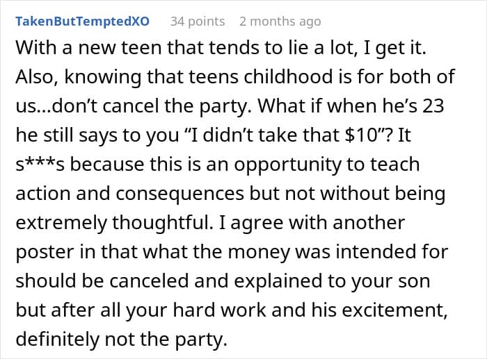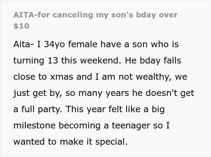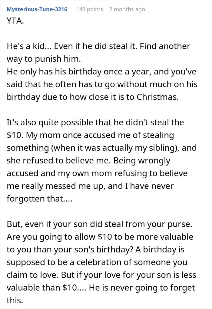 A few days before Christmas, mother and Reddit user Low_Currency_1038 found herself in that exact predicament. After noticing money missing from her wallet, she accused her teenage son of taking it—but when he denied it, she doubled down and canceled his carefully planned birthday party.