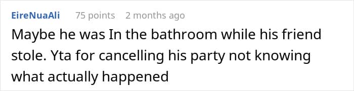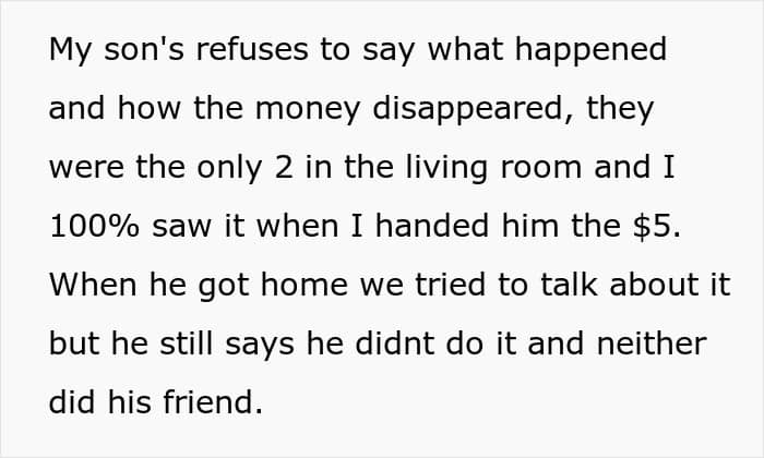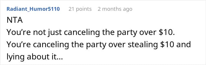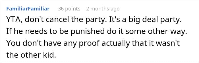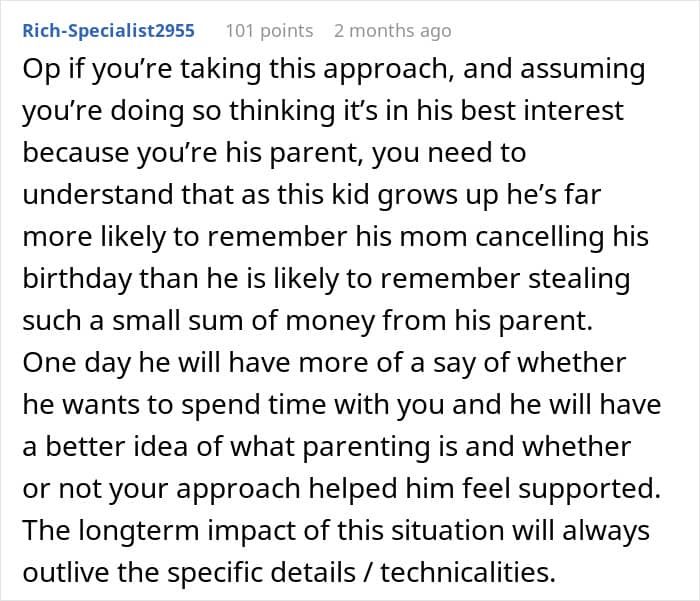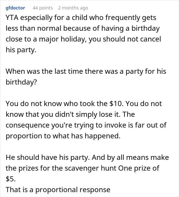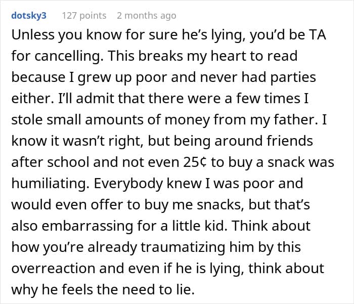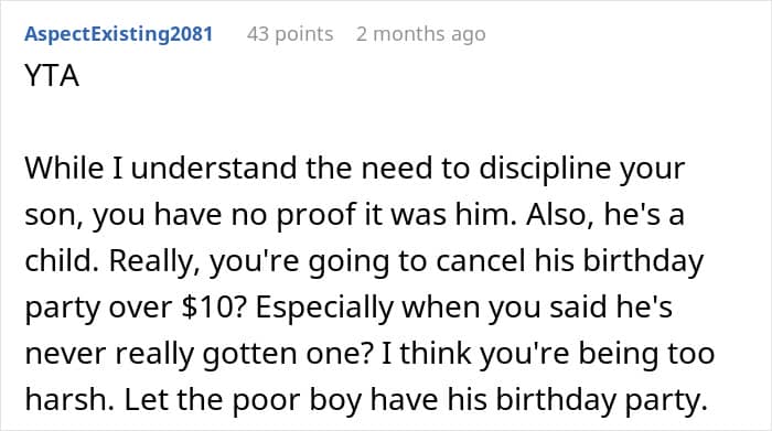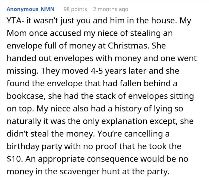 The mother claims that, eventually, the boy confessed to stealing from her. However, the fact that she canceled his birthday party before confirming the truth matters a lot.