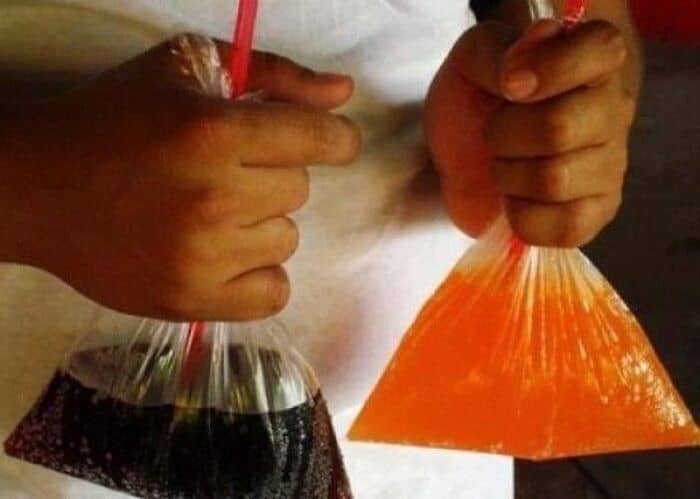 Soda in plastic bags.
