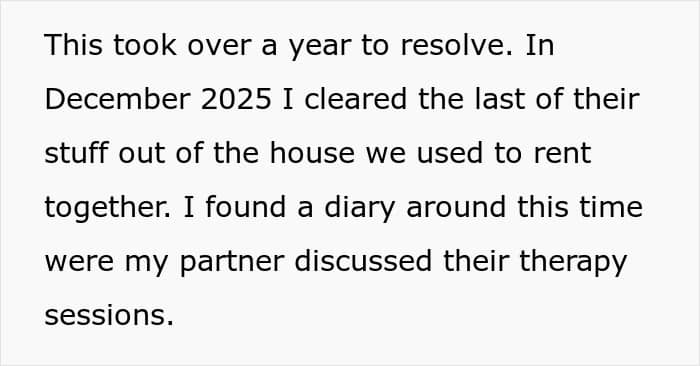 Months later, he found her diary, which revealed the therapist had been actively encouraging the breakup