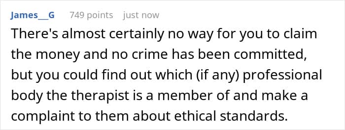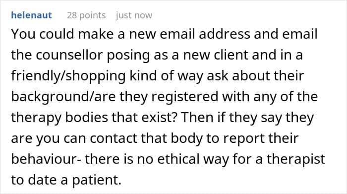 This is both an ethical and a legal issue. Super Lawyers explains that this kind of professional misconduct can absolutely be grounds for a medical malpractice lawsuit. The therapist’s actions would likely be seen as a case of professional negligence and a breach of his duty of care, which could make him liable for damages. But this legal route could be exhausting and financially draining, so is the juice worth the squeeze?