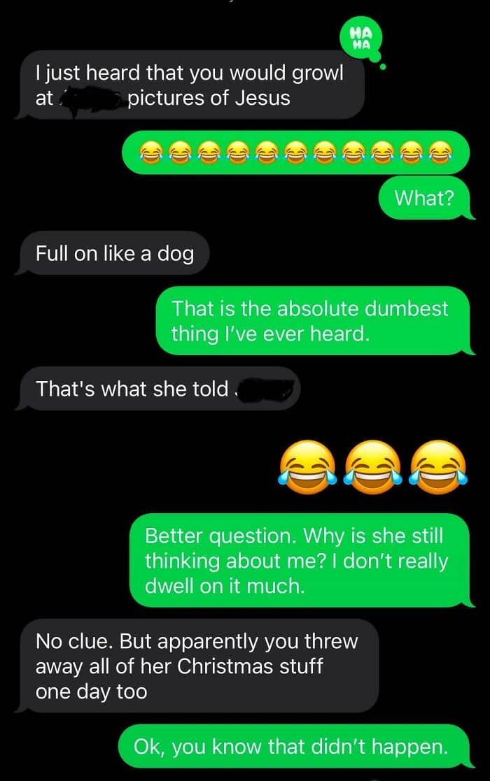 A little backstory. The former coworker is extremely religious, I am not. I listen to metal music, so in her eyes, I must be a satanist. I am not. One incident that kicked all this off was when I still worked there, she had left our business cards for her church. I found them in a spot that would have implied a customer left them there. I’d even asked her what they were, and she looked at me like a dog that had been shown a card trick. Later, I threw them in the trash. The next day, she had the boss pull camera footage, and from that point on was actively trying to get me fired. She eventually succeeded. I have moved on with my life and have a much better job now. Because I’m a friendly person, I’m still friends with several of my former coworkers. They say she still talks about me, except now she’s making things up. I never growled at any pictures. What a silly thing to make up.