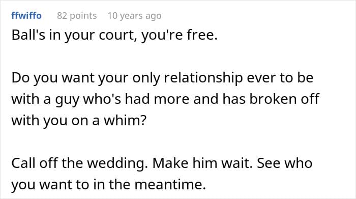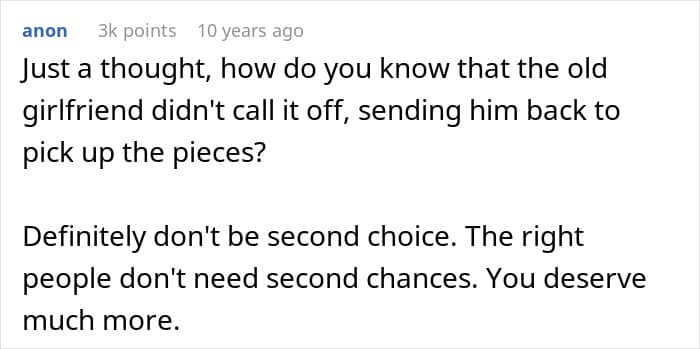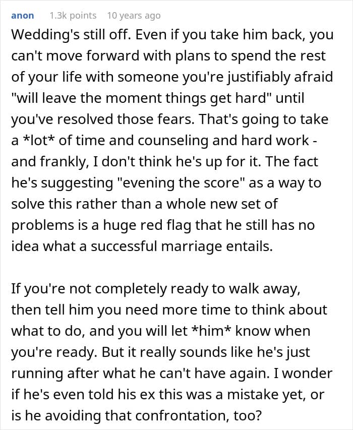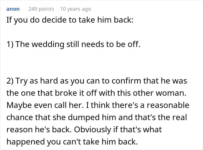 The woman’s fiancé said it himself: “I was in love with what she represented.” He admitted to having feelings for the idealized version of his high school sweetheart, something he may have conjured up himself.