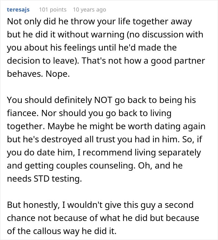 Many people have gone down this road, and this couple is one example. Here, the man suddenly upped and left his fiancée to get back with his high school sweetheart, who by all accounts was “the one that got away.”