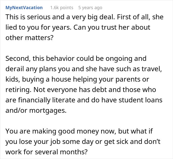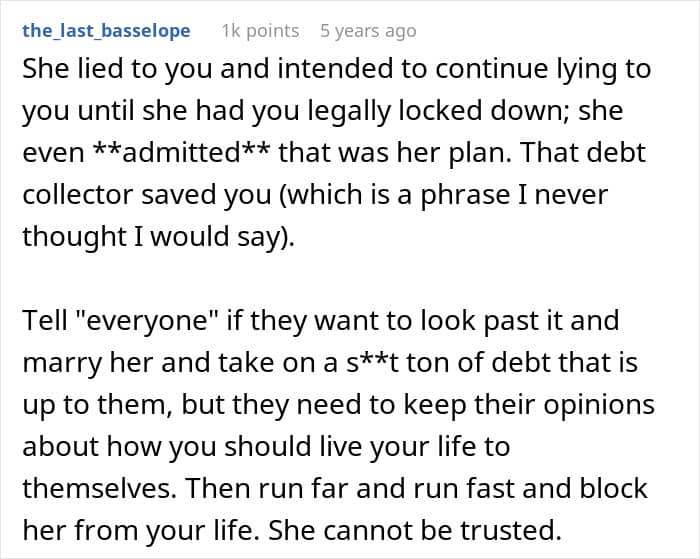 In this case, the man wasn’t only reacting to the amount owed. What unsettled him more was the idea of depending on someone who had kept a major secret for three years. The fact that she had planned to reveal it only after they were married made it harder for him to separate the financial issue from the breach of trust.