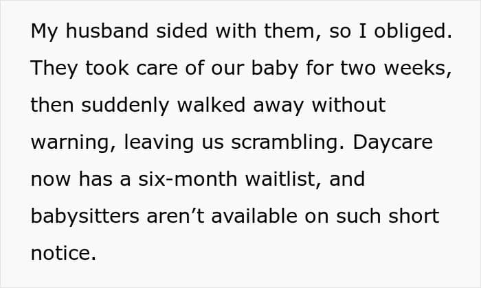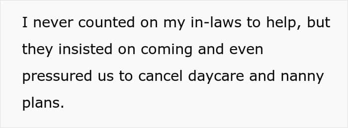 The couple agreed, skipped all their nanny or daycare plans, only for the in-laws to backpedal at the eleventh hour