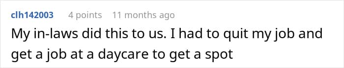 Even though this meant juggling their current jobs, looking for new ones, buying a house from out of state, and generally going through the hassle of moving. Fortunately, the author’s in-laws had announced upfront that they would take care of the kid themselves so that the OP and her husband could fully concentrate on the move.