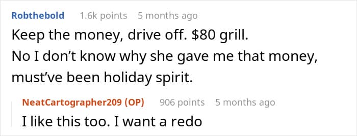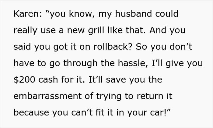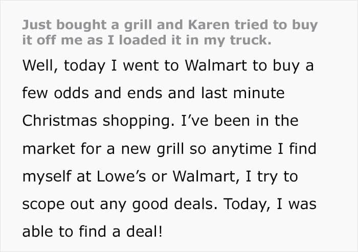 Redditor u/NeatCartographer209 told the online community about the time a woman tried to do her holiday shopping in a parking lot, aiming at his newly bought grill. She requested the man sell it to her and, when he refused, tried taking it herself. That ended in money flying around and far from beautiful holiday wishes imparted. Scroll down to find the full story in the OP’s own words.
