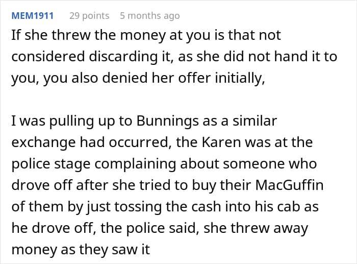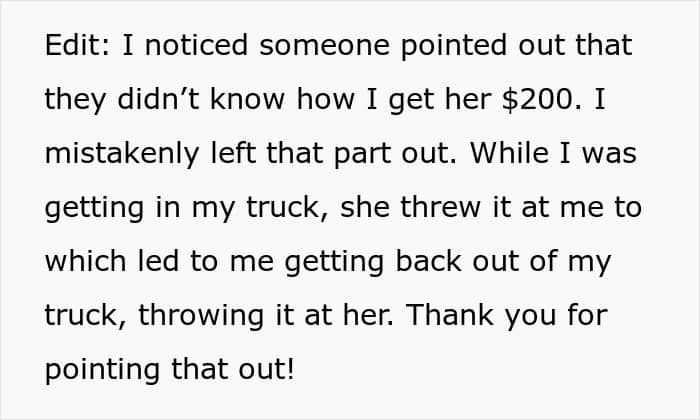 Some people suggested that the OP should have kept the money to himself, but the OP said he was too wrapped up in the heat of the moment to care about her $200. “My instinct wasn’t ‘take the money and run’. I just couldn’t give the money a second thought in that scenario,” he said, detailing that it was two $100 bills that she threw his way.