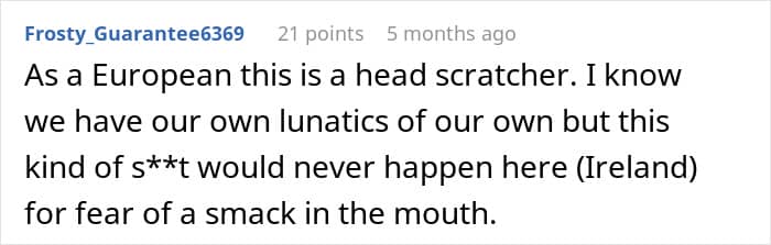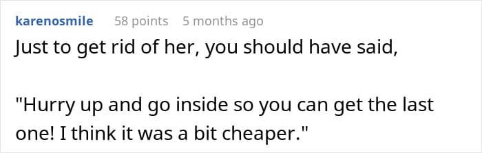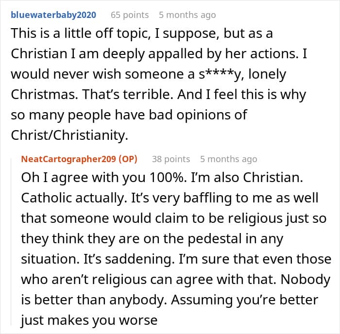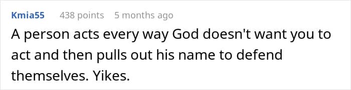 The redditor told We that the part that annoyed him the most was the fact that she tried using God as a way to put herself in a higher position during the confrontation. “It’s not just her that does it either,” he pointed out. “People will use that in an argument and automatically think it puts them on the ‘righteous’ side of any given scenario. People like that make me ashamed to say that I share a religion with them.”