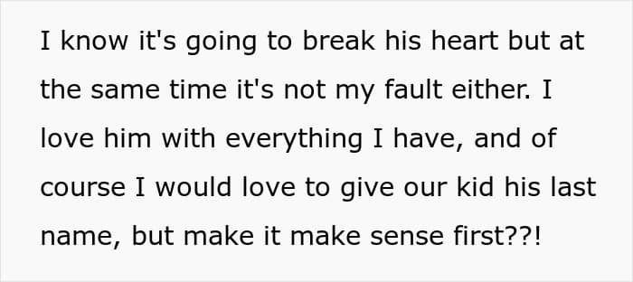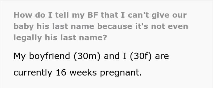 The author of the post is pregnant with her first baby, and her boyfriend desperately wants to give the baby his biological dad’s last name