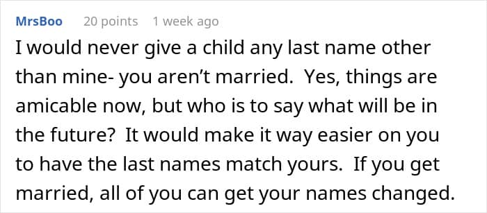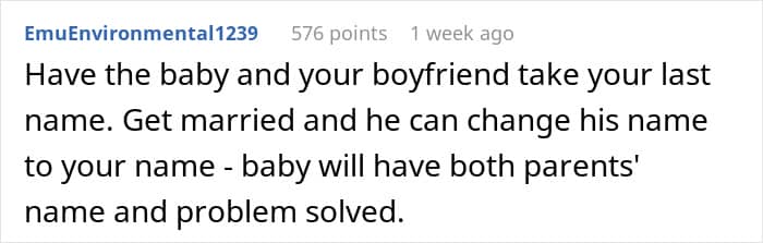 And now the OP’s boyfriend wants the future baby to bear his biological father’s last name. The parents are also considering hyphenating the baby’s name with “his” and the mother’s last name. However, the author’s partner’s preferred option is still simply his biological father’s last name…