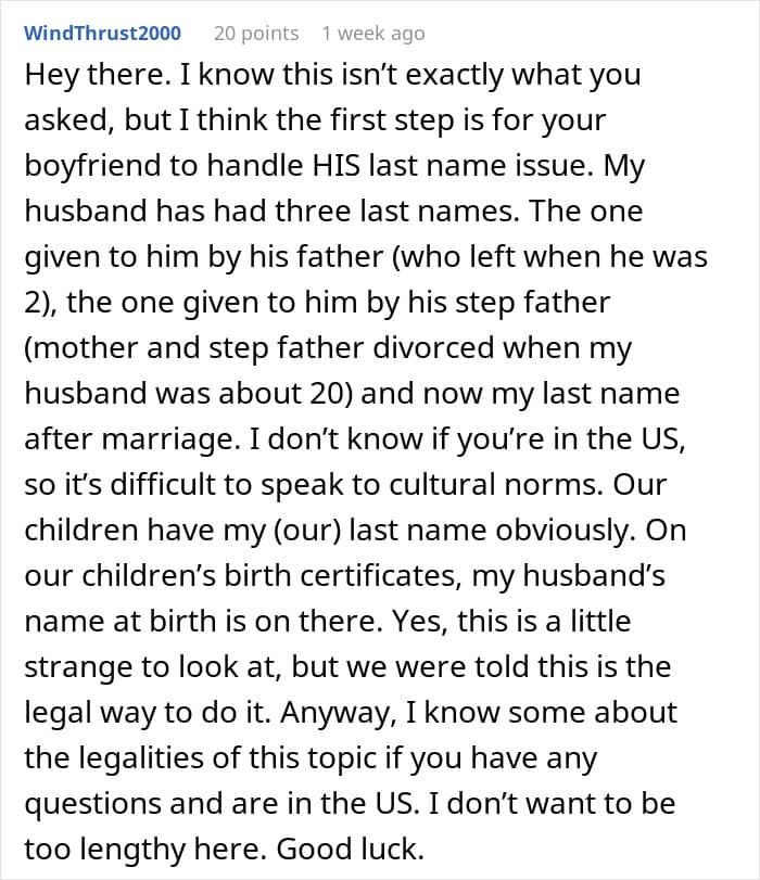Most commenters just suggested that the author’s boyfriend change his last name himself, and then follow the default naming rules