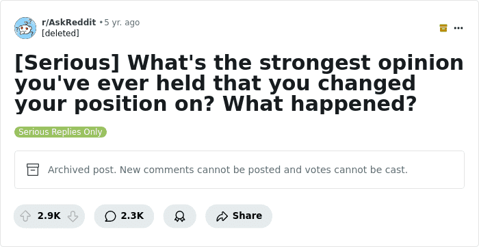 These Redditors, for example, let go of some of their strongest opinions and shared what life threw their way to make it happen. Read their stories below, and if you’ve had a similar experience, tell us in the comments!
